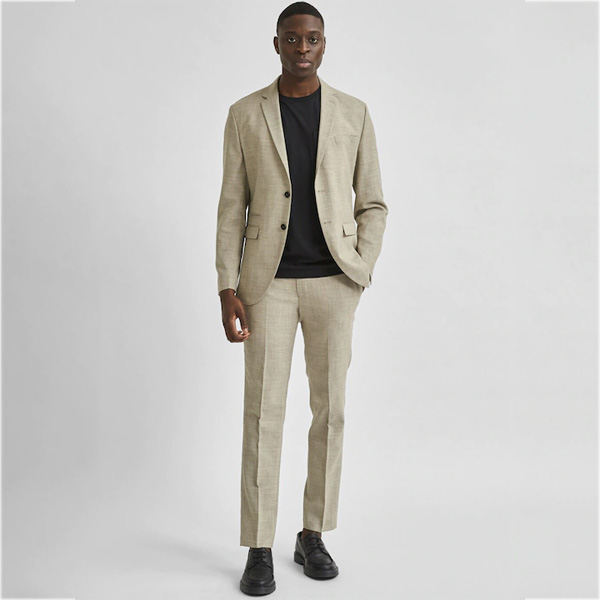 Beige self-design slim-fit formal blazer, has a notched lapel, single-breasted with double button closures, long sleeves, two flap pockets, 1 chest welt pocket